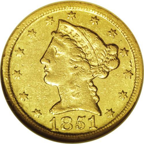 1851-D $5 AU50 NGC. Variety 25-Q. Typically struck, wh 1851-D[$5] AU50 NGC.