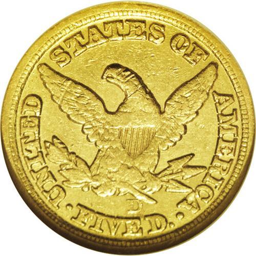<B>1851-D<$5> AU50 NGC.</B></I> Variety 25-Q. Typically struck, which on an 1851-D half eagle equates to average definition on the obverse and considerable bluntness of detail on the eagle. The still-lustrous surfaces exhibit light yellow-gold color with moderate abrasions in the fields. A few more serious cuts are found on the eagle's neck and head.