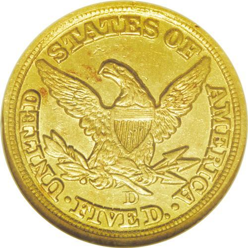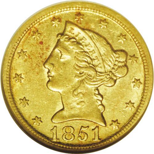 <B>1851-D<$5> AU53 NGC.</B></I> Variety 26-Q. A few russet freckles visit this refreshingly unmarked and partly lustrous Dahlonega five dollar piece. Well struck on the stars and dentils, and only the fletchings and portions of the hair curls lack crisp definition. A rare die combination; 26-R and 25-Q are the usually encountered Strong D marriages.