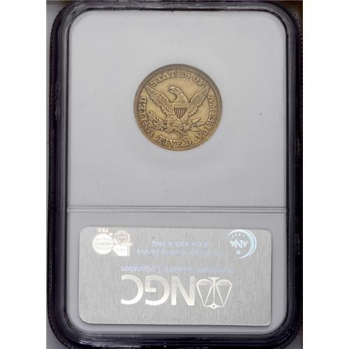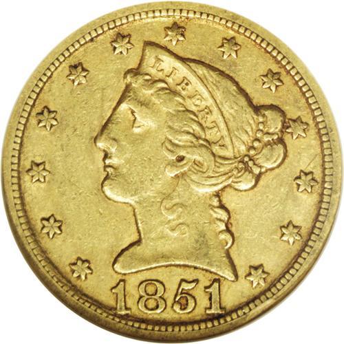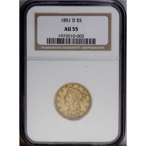 1851-D $5 AU55 NGC. Variety 25-Q. Original, relatively