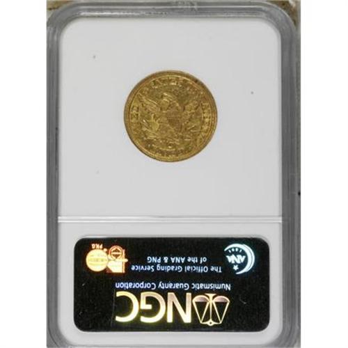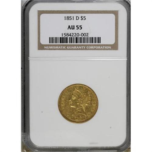 <B>1851-D $5 AU55 NGC.</B></I> Variety 26-R. The base of the first 1 is repunched. A mustard-gold Dahlonega No Motto five with noticeable remaining luster, particularly on the reverse. Small abrasions are scattered, but none are individually of significance. Very rare in Uncirculated, and Choice AU pieces are also desirable. Census: 23 in 55, 29 finer (3/08).<BR><BR><B>Coin Engraver:</B> Christian Gobrecht<BR><BR><b>Shipping:</b> Coins & Currency (<a target="_blank" href="http://www.heritageauctions.com/common/shipping.php">view shipping information</a>)