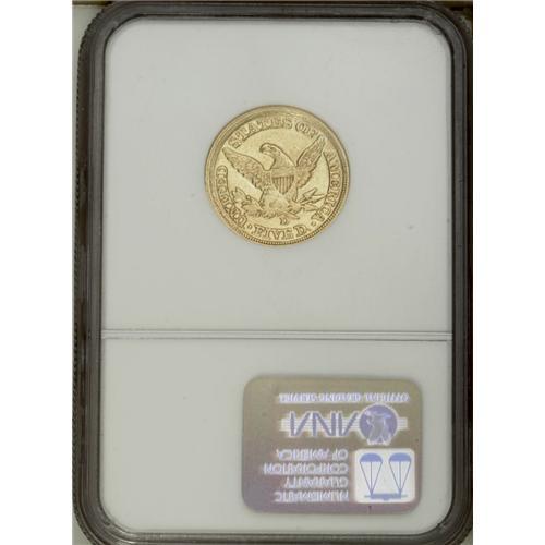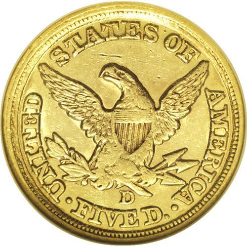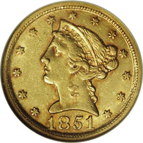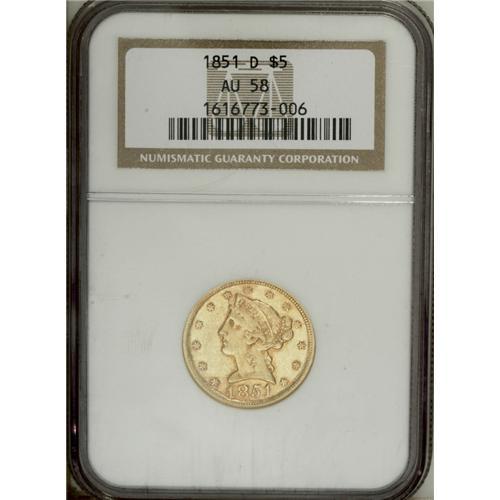 <B>1851-D $5 AU58 NGC.</B></I> Variety 26-R. The '51-D has a mintage of 62,710 pieces, and it is an uncommonly difficult coin in high grades with the majority of known specimens in the Fine to Very Fine grade range. Several other AU58 coins have been certified, but precious few are known above this grade. There is some central striking softness on each side, as usually seen, and some of the denticles are incompletely formed. The surfaces have a dull green-gold color, with red-orange splashes noted near the obverse devices. Unusually bright for a lightly circulated coin, there are a few scattered abrasions on each side. Census: 15 in 58, 12 finer (8/06).<BR><BR><b>Shipping:</b> Coin/Currency (<a target="_blank" href="http://www.heritageauctions.com/common/shipping.php">view shipping information</a>)
