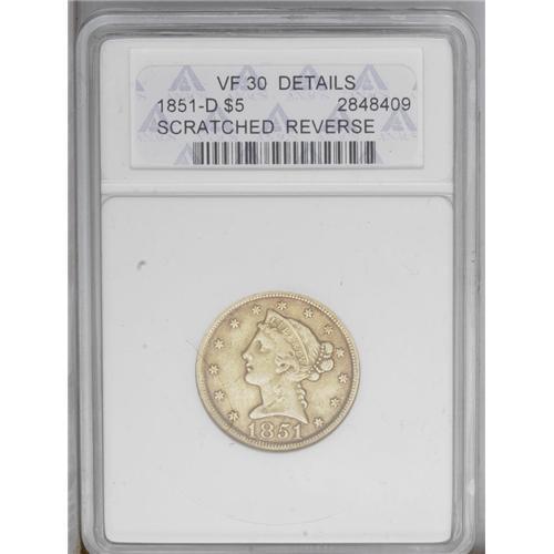 <B>1851-D<$5>--Scratched Reverse--ANACS. VF30 Details.</B></I> Variety 26-R. The first 1 in the date is repunched south. The centers are indifferently struck, the reverse field displays several wispy pinscratches, and a cluster of small marks is noted above the FIV in FIVE. Nevertheless, a collectible example of this elusive D-mint issue. <BR><BR><B>Important notice:</B> Heritage usually auctions material at the rate of 200-250 lots per hour. On some occasions eBay Live bid software or the Internet may not be able to keep up with the pace of the auction. We recommend placing a realistic absentee bid now as insurance to avoid disappointment. Occasionally the auctioneer may eliminate or reject an eBay Live bid, and the auctioneer may also reopen a lot after the close of the eBay live bidding (usually because we missed an audience bid), and may reject your bid even if it shows you as the winning bidder. By bidding via eBay Live, you agree that Heritage may award the lot to another bidder at its sole discretion under the circumstances described above or any other reasonable circumstances. Since eBay bids are not shown to us until we open the lot on the floor, we treat those bids just like floor bids. In most cases the floor responds before the eBay bid is presented to us, due to Internet lag time, so for consistency we have made it a policy that floor bids are always considered first over tie eBay live bids. Also please note that all Heritage lots purchased through eBay Live carry a 20% Buyer's Premium. Please make sure you read the Terms and Conditions before you bid. This lot is being auctioned in conjunction with a live floor auction by Heritage Galleries & Auctioneers. All final auction and invoice information will be supplied by Heritage Galleries & Auctioneers, and all other information should be considered preliminary. Lot:2706 <BR><BR><B>Winning Notification and Billing:</B> After the FINAL session in this auction is complete, Heritage will send e-mail and snail mail invoices. This process normally takes several days. All final auction and invoice information will be supplied by Heritage Galleries & Auctioneers, and all other information should be considered preliminary. <BR><BR>This auction will be conducted on a live auction floor and over the Internet through eBay Live. If you choose to place an absentee bid, please take a moment to <font color='#0000ff'><u><a href='http://pages.ebay.com/liveauctions/help/before/laabsentee.html'>learn how eBay Live absentee bidding works</a></u></font><font color='#000000'>