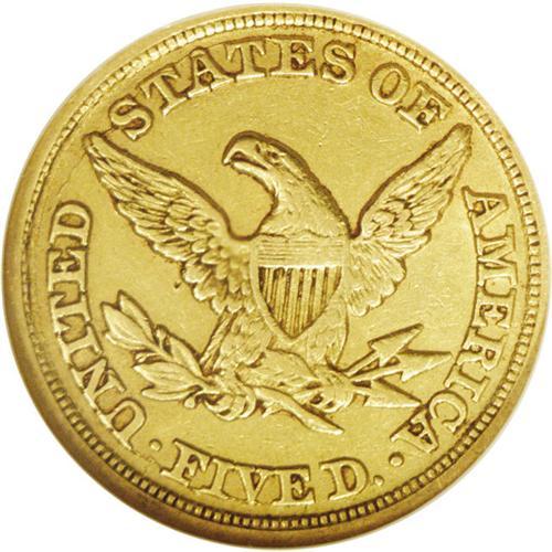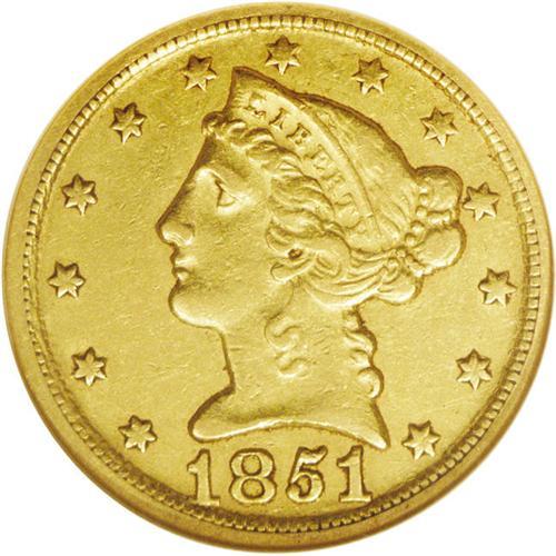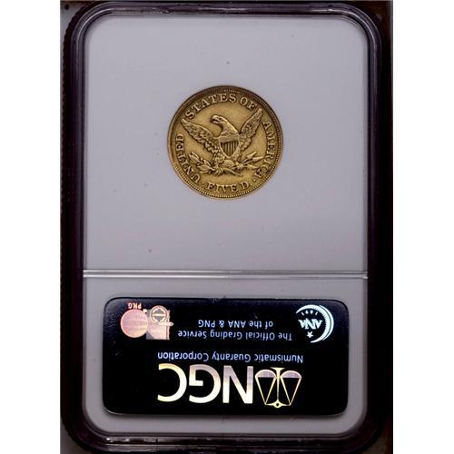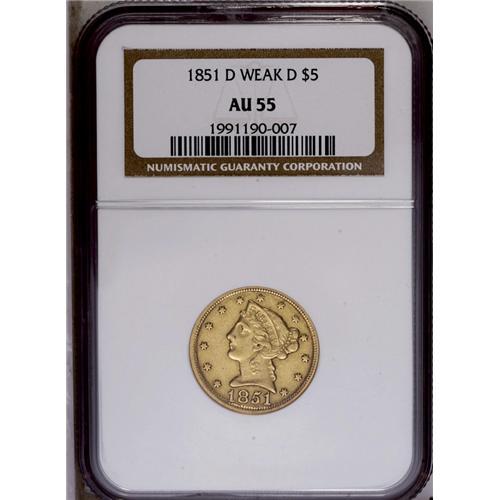 <B>1851-D<$5> Weak D AU55 NGC.</B></I> Variety 26-O. The mintmark, while not invisible, is extremely weak with only portions visible. Specifically, the upper third of the mintmark and the lower left base are visible, the balance merely a shadow of its former self. Pleasing green-gold color with slight abrasions in the fields, but not nearly to the extent normally seen. A pleasing example with hints of luster in the protected areas.