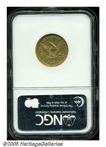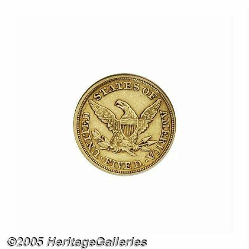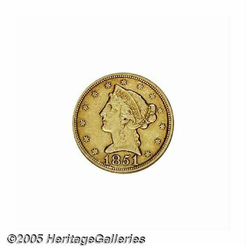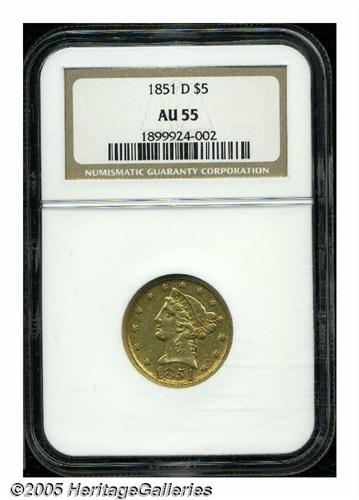 <B>1851-D<$5> Weak D AU55 NGC.</B></I> Winter 26-O, Second Edition. While the mintage was 62,710 pieces, the '51-D is an uncommonly difficult coin in high grades, with the majority of known specimens in the Fine to Very Fine grade range. Typical for the issue, this piece is softly struck in the centers. The first 1 in the date is imbedded in a denticle and shows noticeable repunching, while the lower edge and upper curve of the (typically weak) mintmark are barely visible, using magnification. (This is not due to a weak strike, but is a consequence of excess die polishing at the Dahlonega Mint.) The surfaces show a dull green-gold patina with strongly contrasting bright-orange accents near the peripheries. Lightly marked. Population: 8 in 55, 23 finer (6/05).