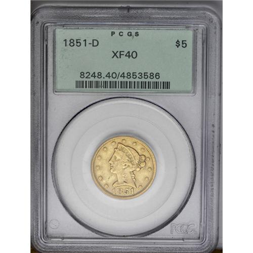 1851-D $5 XF40 PCGS. For accuracy, a large lamination 1851-D