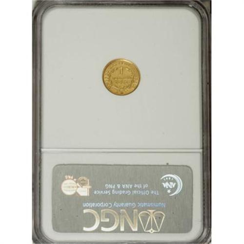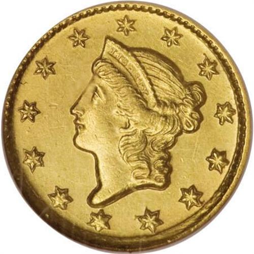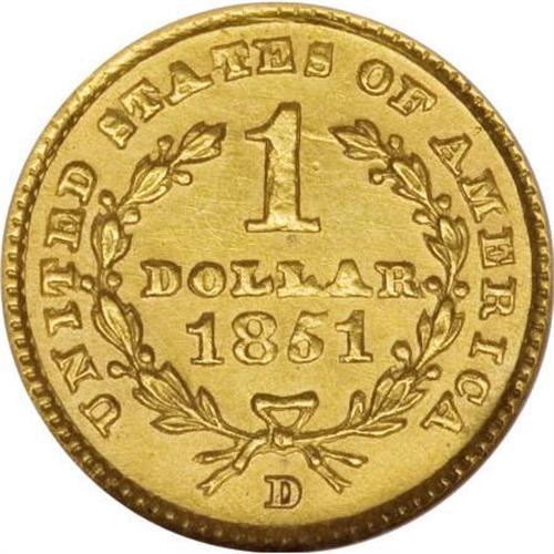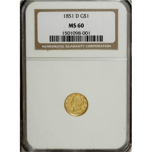 <B>1851-D G$1 MS60 NGC.</B></I> Variety 3-E. Boldly detailed with near-complete hair, star, and wreath detail noted. Natural, soft, green-gold patina can be seen on both sides. There are a few light ticks and hairlines in the fields, but this remains an attractive example. Despite data to the contrary, the 1851-D gold dollar is a scarce coin in Mint State. The grading services show a high number of coins in Uncirculated, but this includes a number of resubmissions.<BR><BR><B>Coin Engraver:</B> James B. Longacre<BR><BR><b>Shipping:</b> Coins & Currency (<a target="_blank" href="http://www.heritageauctions.com/common/shipping.php">view shipping information</a>\)