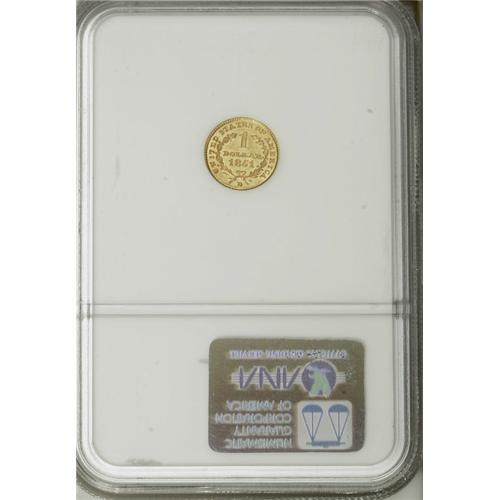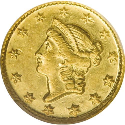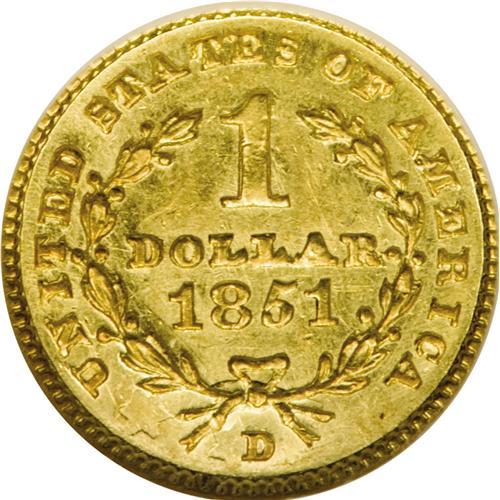 <B>1851-D G$1 MS61 NGC.</B></I> Variety 3-D. With only 9,882 pieces produced of the '51-D gold dollar, one would think that this is a scarce issue in any grade. However, it is actually the second most frequently encountered D-mint Type One gold dollar in overall rarity. However, in Mint State the '51-D is seldom seen, with only 10-12 Uncirculated coins believed extant today. A bit weakly struck in the centers with noticeable clash marks on each side, as often found, the surfaces are green-gold with peach accents and good mint luster. Census: 18 in 61, 34 finer (12/06).<BR><I>From The Frank J. McCarthy Jr. Collection.</B></I><BR><BR><b>Shipping:</b> Coins & Currency (<a target="_blank" href="http://www.heritageauctions.com/common/shipping.php">view shipping information</a>)