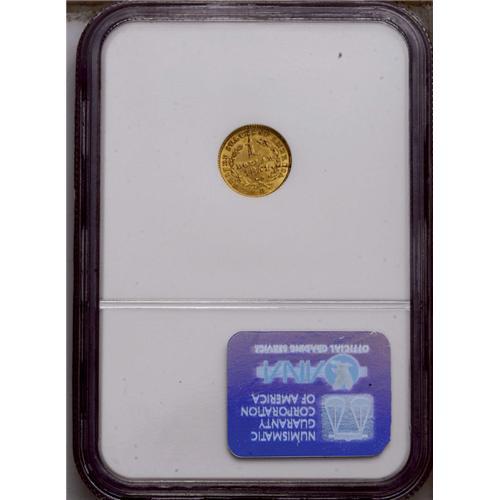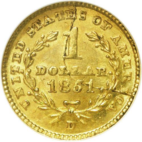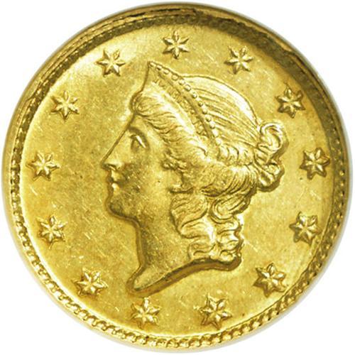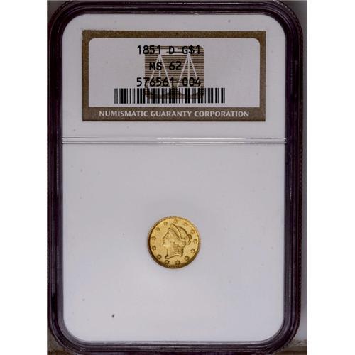<B>1851-D<G$1> MS62 NGC.</B></I> Variety 3-E. A later die state with the reverse die crack forming a large L from the rim above the E in STATES downward, then right to the rim right of the I in AMERICA. One of the more available D-mint gold dollars with a mintage of 9,882 pieces and several Uncirculated pieces known. Sharply struck, except in the center of the reverse, the lustrous surfaces show a significant overlay of reddish patina. <BR><BR><B>Important notice:</B> Heritage usually auctions material at the rate of 200-250 lots per hour. On some occasions eBay Live bid software or the Internet may not be able to keep up with the pace of the auction. We recommend placing a realistic absentee bid now as insurance to avoid disappointment. Occasionally the auctioneer may eliminate or reject an eBay Live bid, and the auctioneer may also reopen a lot after the close of the eBay live bidding (usually because we missed an audience bid), and may reject your bid even if it shows you as the winning bidder. By bidding via eBay Live, you agree that Heritage may award the lot to another bidder at its sole discretion under the circumstances described above or any other reasonable circumstances. Since eBay bids are not shown to us until we open the lot on the floor, we treat those bids just like floor bids. In most cases the floor responds before the eBay bid is presented to us, due to Internet lag time, so for consistency we have made it a policy that floor bids are always considered first over tie eBay live bids. Also please note that all Heritage lots purchased through eBay Live carry a 20% Buyer's Premium. Please make sure you read the Terms and Conditions before you bid. This lot is being auctioned in conjunction with a live floor auction by Heritage Galleries & Auctioneers. All final auction and invoice information will be supplied by Heritage Galleries & Auctioneers, and all other information should be considered preliminary. Lot:2259 <BR><BR><B>Winning Notification and Billing:</B> After the FINAL session in this auction is complete, Heritage will send e-mail and snail mail invoices. This process normally takes several days. All final auction and invoice information will be supplied by Heritage Galleries & Auctioneers, and all other information should be considered preliminary. <BR><BR>This auction will be conducted on a live auction floor and over the Internet through eBay Live. If you choose to place an absentee bid, please take a moment to <font color='#0000ff'><u><a href='http://pages.ebay.com/liveauctions/help/before/laabsentee.html'>learn how eBay Live absentee bidding works</a></u></font><font color='#000000'>