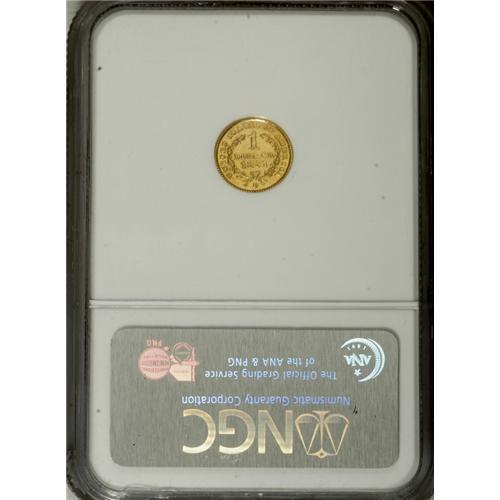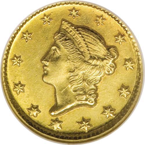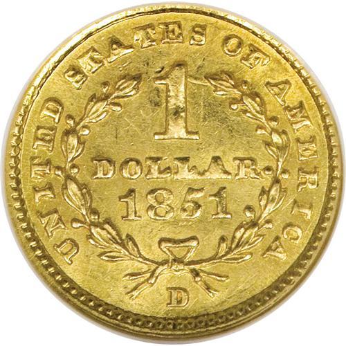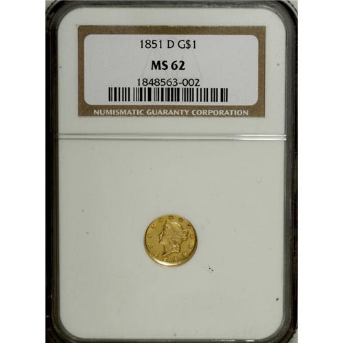 <B>1851-D G$1 MS62 NGC.</B></I> Variety 3-E. Faint recutting shows on the base of the 1 in the date. The surfaces are lustrous amber-gold. This piece appears to be from a late state of the reverse die: There is considerable flatness on LA and the 5 in the date, and the R shows some crumbling on its right foot. The berries to the right of T in UNITED and R in AMERICA join those letters, or virtually so. Census: 24 in 62, 10 finer (1/07).<BR><BR><b>Shipping:</b> Coins & Currency (<a target="_blank" href="http://www.heritageauctions.com/common/shipping.php">view shipping information</a>)