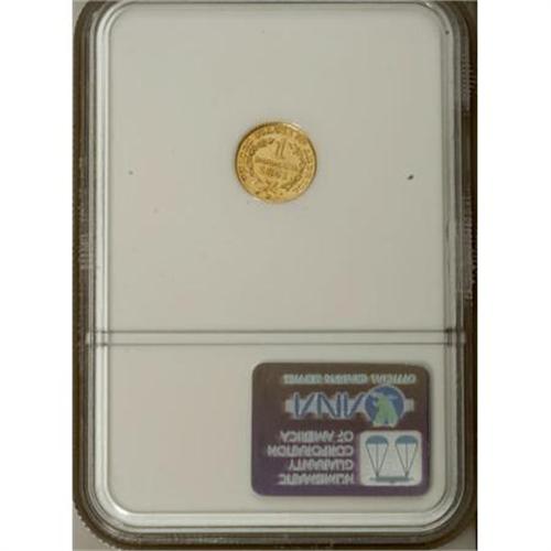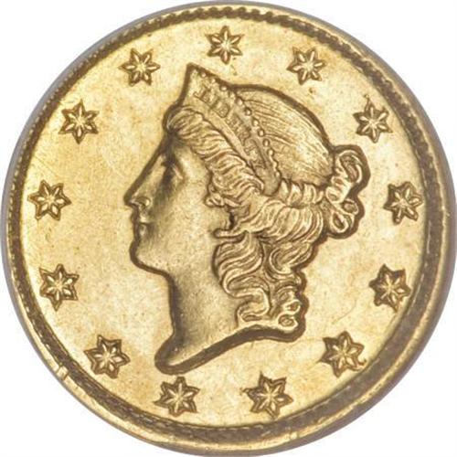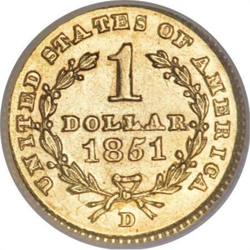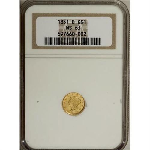 <B>1851-D G$1 MS63 NGC.</B></I> Variety 3-E. It appears that the two varieties of the date, 3-D and 3-E, are about equally plentiful. The 1851-D is a scarce date, with a mintage of only 9,882 coins, although it is actually the second most available Type One gold dollar from Dahlonega. <BR> This amazing piece is one of the finest we have seen, and ranks high in the NGC Census. It is fully brilliant with frosty luster, lovely light yellow surfaces, and sharp design details. Heavy clash marks are visible on both sides of this piece. Census: 5 in 63, 6 finer (1/08).<BR><BR><B>Coin Engraver:</B> James B. Longacre<BR><BR><b>Shipping:</b> Coins & Currency (<a target="_blank" href="http://www.heritageauctions.com/common/shipping.php">view shipping information</a>)