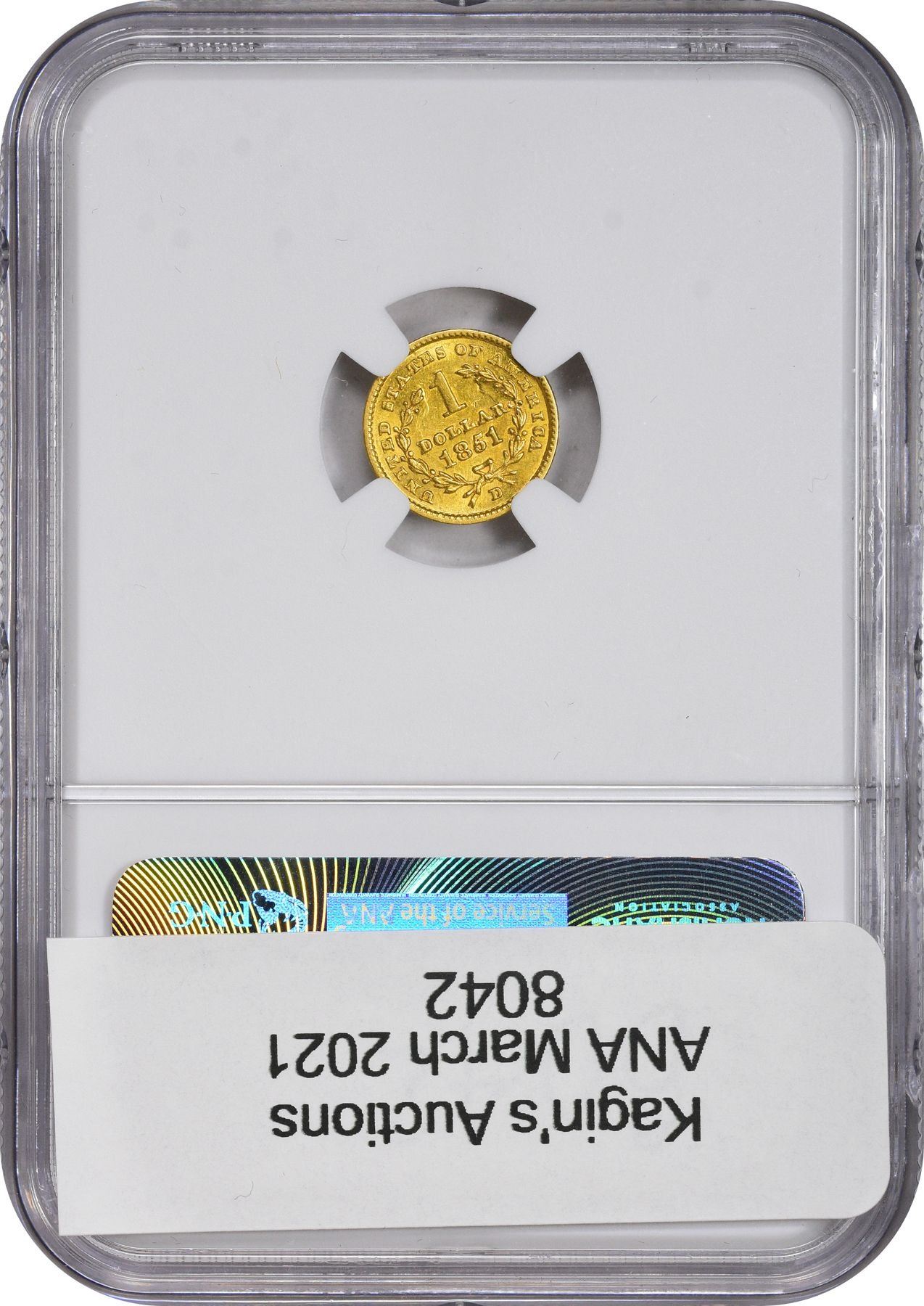 Description: Bright yellow gold with plenty of eye appeal. Strong luster and full mint bloom in the protected areas are but two of the calling cards for this attractive gold dollar. Somewhat typical strike for the date with some weakness at the highest design points. Struck from a heavily clashed reverse die. The scarcer of two varieties of the issue listed by Winter. From a mintage for the date of 9,882 pieces, and a date that allows for today’s type collector to add a bit of flair to his or her working gold type sets. Perhaps only 20 or so Mint State examples of the date are known despite the inflated third-party grading listings. Choice for the grade.
