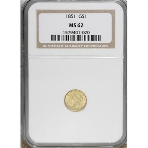 <B>1851 G$1 MS62 NGC.</B></I> NGC Census: (1054/915). PCGS Population (435/780). Mintage: 3,317,671. Numismedia Wsl. Price for NGC/PCGS coin in MS62: $340. (#7513)<BR><BR><B>Coin Engraver:</B> James B. Longacre<BR><BR><b>Shipping:</b> Coins & Currency (<a target="_blank" href="http://www.heritageauctions.com/common/shipping.php">view shipping information</a>)
