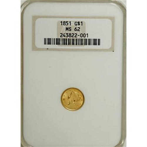 <B>1851 G$1 MS62 NGC.</B></I> NGC Census: (1049/914). PCGS Population (435/780). Mintage: 3,317,671. Numismedia Wsl. Price for NGC/PCGS coin in MS62: $340. (#7513)<BR><BR><B>Coin Engraver:</B> James B. Longacre<BR><BR><b>Shipping:</b> Coins & Currency (<a target="_blank" href="http://www.heritageauctions.com/common/shipping.php">view shipping information</a>)