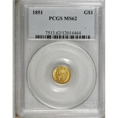 <B>1851 G$1 MS62 PCGS.</B></I> PCGS Population (434/776). NGC Census: (1049/914). Mintage: 3,317,671. Numismedia Wsl. Price for NGC/PCGS coin in MS62: $340. (#7513)<BR><BR><B>Coin Engraver:</B> James B. Longacre<BR><BR><b>Shipping:</b> Coins & Currency (<a target="_blank" href="http://www.heritageauctions.com/common/shipping.php">view shipping information</a>)