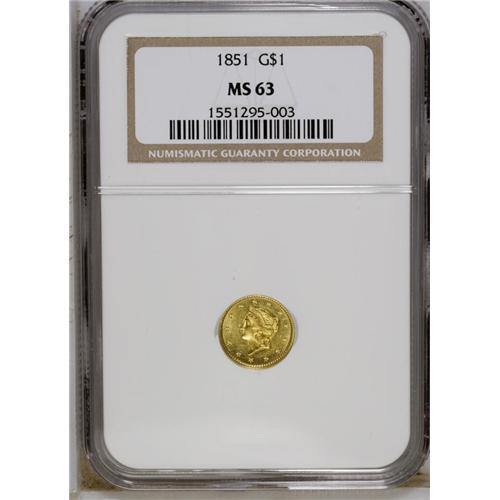 1851 G$1 MS63 NGC. A sharply struck struck yellow-gold