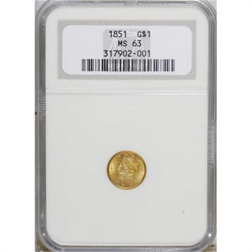 <B>1851 G$1 MS63 NGC.</B></I> A sharply struck example of this popular high-mintage issue, primarily orange-gold with hints of pink in the fields. Excellent eye appeal for the grade assigned.<BR><BR><B>Coin Engraver:</B> James B. Longacre<BR><BR><b>Shipping:</b> Coins & Currency (<a target="_blank" href="http://www.heritageauctions.com/common/shipping.php">view shipping information</a>)