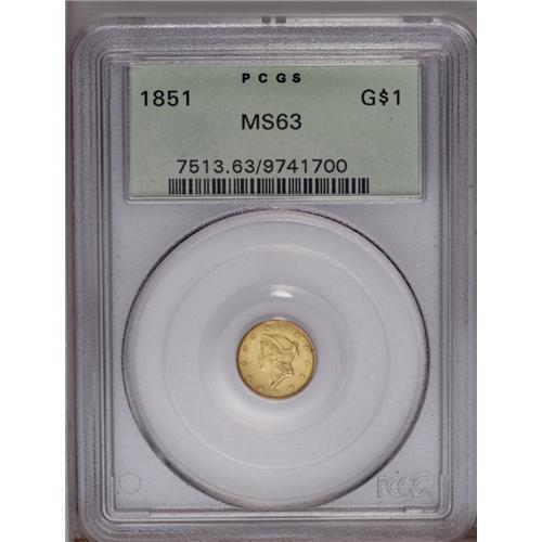<B>1851 G$1 MS63 PCGS.</B></I> A nicely struck and satiny gold piece that has retained its original mustard-yellow color. Housed in a green label holder.