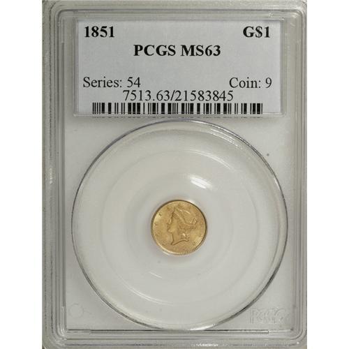 <B>1851 G$1 MS63 PCGS.</B></I> PCGS Population (426/333). NGC Census: (964/830). Mintage: 3,317,671. Numismedia Wsl. Price for NGC/PCGS coin in MS63: $770. (#7513)<BR><BR><b>Shipping:</b> Coins & Currency (<a target="_blank" href="http://www.heritageauctions.com/common/shipping.php">view shipping information</a>)