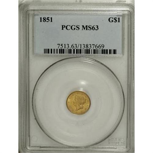 <B>1851 G$1 MS63 PCGS.</B></I> An original and sharply struck green-gold representative of the Type One design. The eye appeal is pleasing despite a few unimportant field grazes.<BR><I>From The Pearl E. Pemberton Collection.</B></I><BR><BR><B>Coin Engraver:</B> James B. Longacre<BR><BR><b>Shipping:</b> Coins & Currency (<a target="_blank" href="http://www.heritageauctions.com/common/shipping.php">view shipping information</a>)