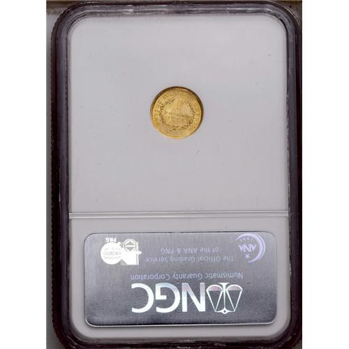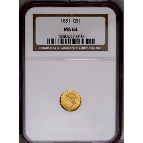 <B>1851<G$1> MS64 NGC.</B></I> Apricot-gold surfaces emit frosty luster and sharply executed design elements. A short, rather inoffensive pinscratch in the upper reverse field helps to limit the grade. Overall, a very pleasing gold dollar.