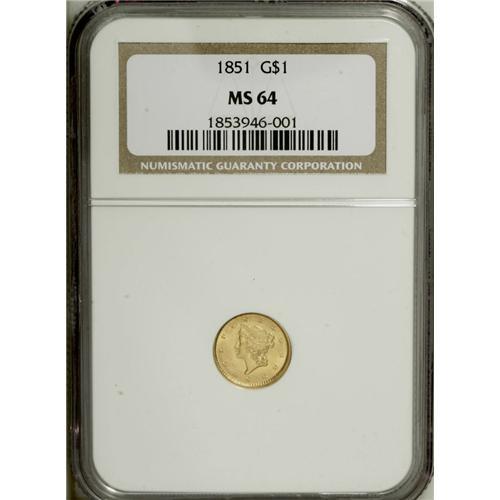 1851 G$1 MS64 NGC. Boldly struck with a lovely, lustro