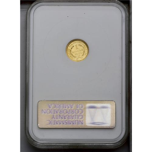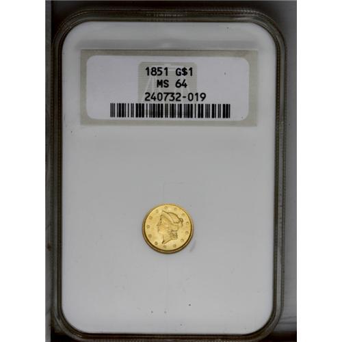 <B>1851<G$1> MS64 NGC.</B></I> Sharply struck with sparkling mint frost over both sides, this bright yellow-gold example displays a shallow luster graze in the upper left obverse field, and a pair of faint pinscratches on the upper reverse that prevent a higher grade. A pleasing near-Gem example of this popular, common date Type One gold dollar. <BR><BR><B>Important notice:</B> Heritage usually auctions material at the rate of 200-250 lots per hour. On some occasions eBay Live bid software or the Internet may not be able to keep up with the pace of the auction. We recommend placing a realistic absentee bid now as insurance to avoid disappointment. Occasionally the auctioneer may eliminate or reject an eBay Live bid, and the auctioneer may also reopen a lot after the close of the eBay live bidding (usually because we missed an audience bid), and may reject your bid even if it shows you as the winning bidder. By bidding via eBay Live, you agree that Heritage may award the lot to another bidder at its sole discretion under the circumstances described above or any other reasonable circumstances. Since eBay bids are not shown to us until we open the lot on the floor, we treat those bids just like floor bids. In most cases the floor responds before the eBay bid is presented to us, due to Internet lag time, so for consistency we have made it a policy that floor bids are always considered first over tie eBay live bids. Also please note that all Heritage lots purchased through eBay Live carry a 20% Buyer's Premium. Please make sure you read the Terms and Conditions before you bid. This lot is being auctioned in conjunction with a live floor auction by Heritage Galleries & Auctioneers. All final auction and invoice information will be supplied by Heritage Galleries & Auctioneers, and all other information should be considered preliminary. Lot:2255 <BR><BR><B>Winning Notification and Billing:</B> After the FINAL session in this auction is complete, Heritage will send e-mail and snail mail invoices. This process normally takes several days. All final auction and invoice information will be supplied by Heritage Galleries & Auctioneers, and all other information should be considered preliminary. <BR><BR>This auction will be conducted on a live auction floor and over the Internet through eBay Live. If you choose to place an absentee bid, please take a moment to <font color='#0000ff'><u><a href='http://pages.ebay.com/liveauctions/help/before/laabsentee.html'>learn how eBay Live absentee bidding works</a></u></font><font color='#000000'>