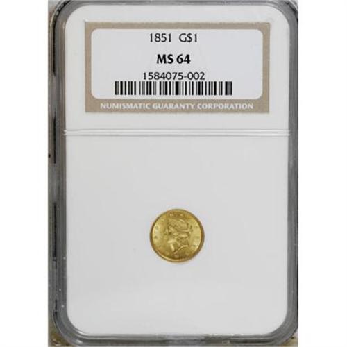 <B>1851 G$1 MS64 NGC.</B></I> Sharply struck, with lovely yellow-gold luster. This would be full Gem save for a few minor luster grazes.<BR><BR><B>Coin Engraver:</B> James B. Longacre<BR><BR><b>Shipping:</b> Coins & Currency (<a target="_blank" href="http://www.heritageauctions.com/common/shipping.php">view shipping information</a>)