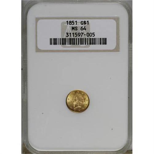 <B>1851 G$1 MS64 NGC.</B></I> NGC Census: (322/110). PCGS Population (263/87). Mintage: 3,317,671. Numismedia Wsl. Price for NGC/PCGS coin in MS64: $1,660. (#7513)<BR><BR><B>Coin Engraver:</B> James B. Longacre<BR><BR><b>Shipping:</b> Coins & Currency (<a target="_blank" href="http://www.heritageauctions.com/common/shipping.php">view shipping information</a>)