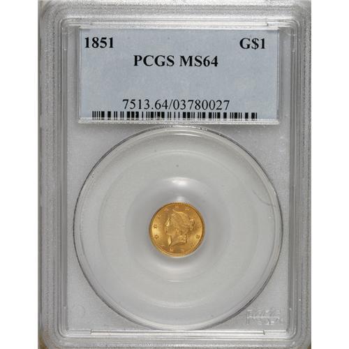 <B>1851 G$1 MS64 PCGS.</B></I> Rich apricot-gold patination exudes traces of light green and tan, all of which rest upon lustrous surfaces. A sharp strike is noted, except for some minor softness on portions of the reverse date. A few inoffensive handling marks limit the grade, and the reverse is lightly clash-marked and rotated a few degrees counterclockwise.<BR><BR><b>Shipping:</b> Coins & Currency (<a target="_blank" href="http://www.heritageauctions.com/common/shipping.php">view shipping information</a>)