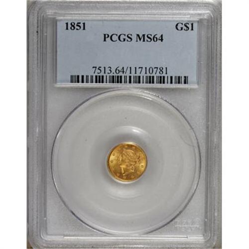 <B>1851 G$1 MS64 PCGS.</B></I> The Philadelphia Mint coined an unprecedented quantity of gold in the early 1850s, including many examples of the newly created gold dollar denomination. This sharply struck Choice example has frosty, subtly lustrous butter-yellow surfaces that show few marks for the grade.<BR><BR><B>Coin Engraver:</B> James B. Longacre<BR><BR><b>Shipping:</b> Coins & Currency (<a target="_blank" href="http://www.heritageauctions.com/common/shipping.php">view shipping information</a>)
