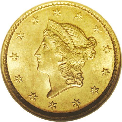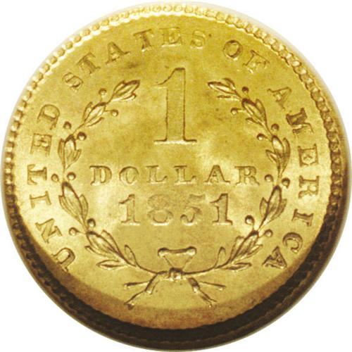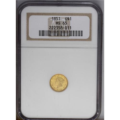 <B>1851 G$1 MS65 NGC.</B></I> Satiny with rich golden coloration and razor sharp detail in virtually all areas. Only the tops of 85 in the date show appreciable mushiness. An ideal type coin candidate. Census: 80 in 65, 23 finer (1/06).