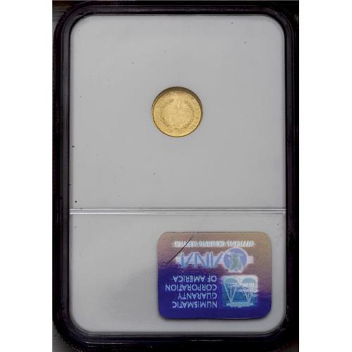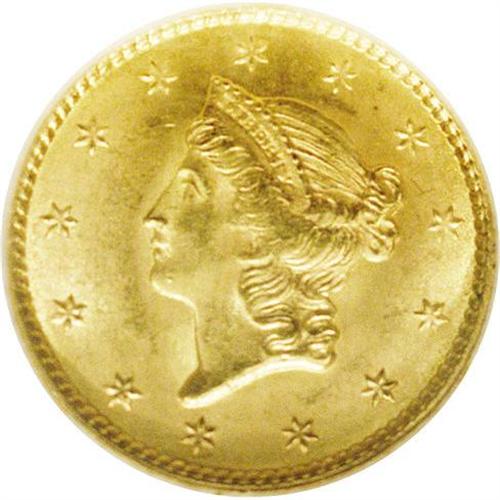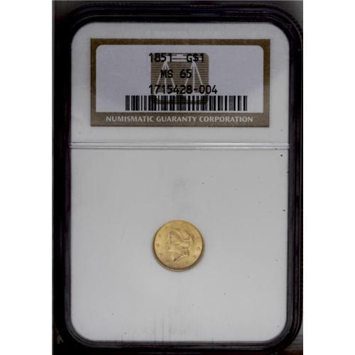 <B>1851<G$1> MS65 NGC.</B></I> The 1851 is a common date among Type One gold dollars, and it is one that can frequently be located in Uncirculated condition. This is a lovely coin that has rich copper-gold mint frost. Not fully struck at the centers, the only surface disturbances are a couple of very shallow luster grazes in the reverse field. An excellent choice as a type coin.