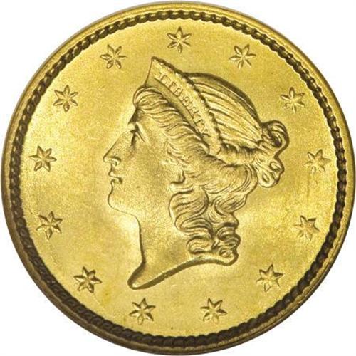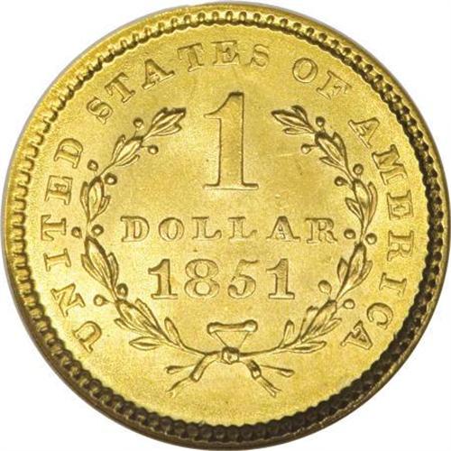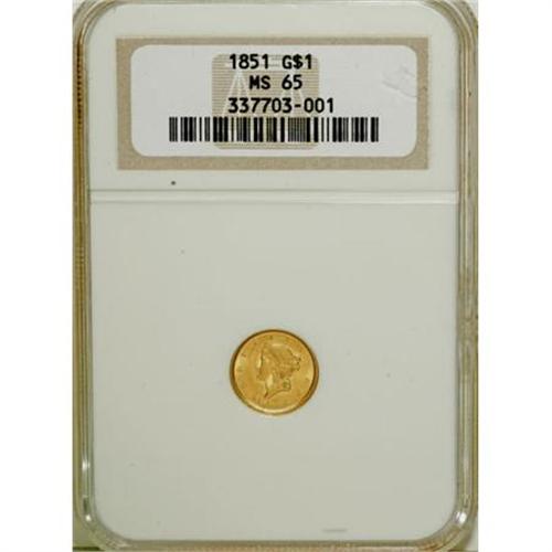 <B>1851 G$1 MS65 NGC.</B></I> One of the most common dates in the Type One gold dollar series, and a great choice for type purposes. This Gem is vibrantly lustrous and sharply struck, with noticeably crisp details on Liberty's hair. Faint clash marks and luster grazes are noted in the obverse fields. Population: 57 in 65, 30 finer (11/07). <BR><I>From The Florissant Collection.</B></I><BR><BR><B>Coin Engraver:</B> James B. Longacre<BR><BR><b>Shipping:</b> Coins & Currency (<a target="_blank" href="http://www.heritageauctions.com/common/shipping.php">view shipping information</a>)