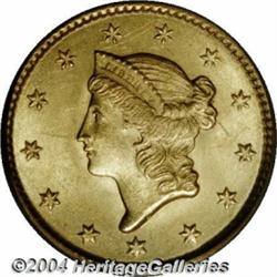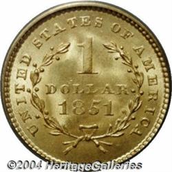 <table><tr><td><TABLE cellSpacing=0 cellPadding=0 width="100%" bgColor=#000000 border=0><TBODY> <TR><TD width="100%"><TABLE cellSpacing=1 cellPadding=3 width="100%" border=0><TBODY><TR><TD width="100%" bgColor=#79735c><FONT face=arial color=#ffffff size=3><B>Description</B> </FONT></TD></TR><TR><TD width="100%" bgColor=#ffffff><FONT face=arial size=2><B>1851 G$1 MS65 PCGS.</B></I> The 1851 is a common date among Type One gold dollars, and it is one that can frequently be located in Uncirculated condition. This is a lovely coin that has rich green-gold mint frost. Well, but not fully struck, the only surface disturbances are a couple of very shallow luster grazes in the right obverse field. Population: 49 in 65, 24 finer (10/03). </FONT></TD></TR></TBODY></TABLE></TD></TR></TBODY></TABLE><BR><A name=PricesRealized></A><TABLE cellSpacing=0 cellPadding=0 width="100%" bgColor=#000000 border=0><TBODY><TR><TD width="100%"><TABLE cellSpacing=1 cellPadding=3 width="100%" border=0><TBODY><TR><TD width="100%" bgColor=#79735c><A name=PR><FONT face=arial color=#ffffff size=3><B>Previous Prices from Heritage Auctions</B> </FONT></A></TD></TR><TR><TD bgColor=#f6f6ed><TABLE cellSpacing=0 cellPadding=0 width="100%" border=1><TBODY><TR><TD align=middle width="33%"><B>Date</B></TD><TD align=middle width="33%"><B>Service</B></TD><TD align=middle width="33%"><B>Price</B></TD></TR><TR bgColor=whitesmoke><TD width="33%"><B>09/25/1999</B></TD><TD width="33%">NGC</TD><TD width="33%">$3,910.00</TD></TR><TR bgColor=whitesmoke><TD width="33%"><B>06/06/1997</B></TD><TD width="33%">PCGS</TD><TD width="33%">$5,175.00</TD></TR><TR bgColor=whitesmoke><TD width="33%"><B>09/12/2000</B></TD><TD width="33%">NGC</TD><TD width="33%">$3,450.00</TD></TR><TR bgColor=whitesmoke><TD width="33%"><B>02/01/1992</B></TD><TD width="33%">PCGS</TD><TD width="33%">$6,875.00</TD></TR><TR bgColor=whitesmoke><TD width="33%"><B>11/01/1993</B></TD><TD width="33%">PCGS</TD><TD width="33%">$4,840.00</TD></TR><TR bgColor=whitesmoke><TD width="33%"><B>05/01/1999</B></TD><TD width="33%">NGC</TD><TD width="33%">$4,370.00</TD></TR></TBODY></TABLE></TD></TR><TR><TD bgColor=#ffffff><FONT face=arial size=1 ?>PLEASE NOTE: All prices realized reflect the final hammer price PLUS the buyer's premium in auctions that charge a buyer's premium. Each item has a notation at the top of the listing indicating whether that lot included a buyer's premium. Example: A item that sells with a final hammer price of $100 and a 20% buyer's premium will display with a price realized of $120. All information listed is intended to be as accurate as possible, but errors are possible. Please use this guide carefully and inform us of any inaccuracies. </FONT></TD></TR></TBODY></TABLE></TD></TR></TBODY></TABLE><BR><TABLE cellSpacing=0 cellPadding=0 width="100%" bgColor=#000000 border=0><TBODY><TR><TD width="100%"><TABLE cellSpacing=1 cellPadding=3 width="100%" border=0><TBODY><TR><TD width="100%" bgColor=#79735c colSpan=6><FONT face=arial color=#ffffff size=3><B>Price Guide*</B> </FONT></TD></TR><TR bgColor=#f6f6ed><TD align=middle><B>Grade</B> </TD><TD align=middle><B>Coin World<BR>(Trends)</B> </TD><TD align=middle><B>Numismedia<BR>Retail</B> </TD><TD align=middle><B>Numismedia<BR>Wholesale</B> </TD><TD align=middle><B>Coin<BR>Universe</B> </TD><TD align=middle><B>Heritage<BR>Value Index</B> </TD></TR><TR bgColor=#ffffff><TD align=middle>64</TD><TD align=right>$2,000.00</TD><TD align=right>---</TD><TD align=right>$1,375.00</TD><TD align=right>$1,950.00</TD><TD align=right>$1,416.25</TD></TR><TR style="FONT-WEIGHT: bold" bgColor=#cccfdd><TD align=middle>65</TD><TD align=right>$5,500.00</TD><TD align=right>---</TD><TD align=right>$3,150.00</TD><TD align=right>$6,000.00</TD><TD align=right>$3,988.75</TD></TR><TR bgColor=#ffffff><TD align=middle>66</TD><TD align=right>$15,000.00</TD><TD align=right>---</TD><TD align=right>$6,250.00</TD><TD align=right>$9,750.00</TD><TD align=right>$8,595.00</TD></TR><TR bgColor=#ffffff><TD colSpan=6><FONT size=1>*All information listed is intended to be as accurate as possible, but errors are possible. No item may be returned or refused based on this information which is provided as a service to our customers. You should contact each pricing source directly to determine the accuracy of this information. </FONT></TD></TR></TBODY></TABLE></TD></TR></TBODY></TABLE><BR><TABLE cellSpacing=0 cellPadding=0 width="100%" bgColor=#000000 border=0><TBODY><TR><TD width="100%"><TABLE cellSpacing=1 cellPadding=3 width="100%" border=0><TBODY><TR><TD width="100%" bgColor=#79735c><FONT face=arial color=#ffffff size=3><B>Population Guide</B> </FONT></TD></TR><TR bgColor=#ffffff><TD align=middle><!-- Begin Output of Population Grid--><TABLE cellSpacing=0 cellPadding=0 width="100%" border=0><TBODY><TR><TD vAlign=center><TABLE cellSpacing=0 width="100%" border=1 cellsadding="3"><TBODY><TR><TD vAlign=center><TABLE cellSpacing=0 cellPadding=3 width="100%" border=1><TBODY><TR><TD vAlign=center align=middle bgColor=#f0f1e8 colSpan=2 <CENTER><FONT face=Arial size=2><B>PCGS Pop </B></FONT><CENTER></CENTER></TD><TD vAlign=center align=middle bgColor=#f0f1e8 colSpan=2><CENTER><FONT face=Arial size=2><B>NGC Pop</B></CENTER></FONT></TD></TR><TR><TD vAlign=center><FONT face=Arial size=2>(65)</FONT> </TD><TD vAlign=center align=right><FONT face=Arial size=2>49</FONT> </TD><TD vAlign=center><FONT face=Arial size=2>(65)</FONT> </TD><TD vAlign=center align=right><FONT face=Arial size=2>75</FONT> </TD></TR><TR><TD vAlign=center><FONT face=Arial size=2>(>65)</FONT> </TD><TD vAlign=center align=right><FONT face=Arial size=2>26</FONT> </TD><TD vAlign=center><FONT face=Arial size=2>(>65)</FONT> </TD><TD vAlign=center align=right><FONT face=Arial size=2>23</FONT> </TD></TR></TBODY></TABLE></TD></TR></TBODY></TABLE></TD></TR></TBODY></TABLE><!-- End Output of Population Grid--></TD></TR></TBODY></TABLE></TD></TR></TBODY></TABLE><BR><TABLE cellSpacing=0 cellPadding=0 width="100%" bgColor=#0