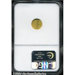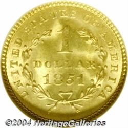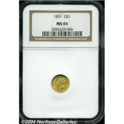 <B>1851<G$1> MS66 NGC.</B></I> Lemon-gold patina fills the fields of this carefully preserved and suitably struck representative. Although Philadelphia Mint Type One Gold Dollars had high mintages for their era, these pieces were needed in commerce. California gold mines produced unheard-of quantities of the precious yellow metal, which drove silver coins out of circulation until their weight was reduced in 1854. As a result, small denomination gold coins of the era were favored in circulation, and few 1851 gold dollars survive in lofty Mint State grades. Population: 17 in 66, 7 finer (6/04). <BR><BR><B>Important notice:</B> Heritage usually auctions material at the rate of 200-250 lots per hour. On some occasions eBay Live bid software or the Internet may not be able to keep up with the pace of the auction. We recommend placing a realistic absentee bid now as insurance to avoid disappointment. Occasionally the auctioneer may eliminate or reject an eBay Live bid, and the auctioneer may also reopen a lot after the close of the eBay live bidding (usually because we missed an audience bid), and may reject your bid even if it shows you as the winning bidder. By bidding via eBay Live, you agree that Heritage may award the lot to another bidder at its sole discretion under the circumstances described above or any other reasonable circumstances. Since eBay bids are not shown to us until we open the lot on the floor, we treat those bids just like floor bids. In most cases the floor responds before the eBay bid is presented to us, due to Internet lag time, so for consistency we have made it a policy that floor bids are always considered first over tie eBay live bids. Also please note that all Heritage lots purchased through eBay Live carry a 20% Buyer's Premium. Please make sure you read the Terms and Conditions before you bid. </span></font></tr></table></td></tr></table>