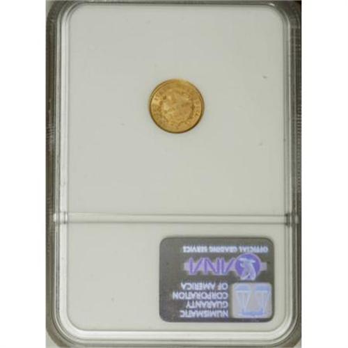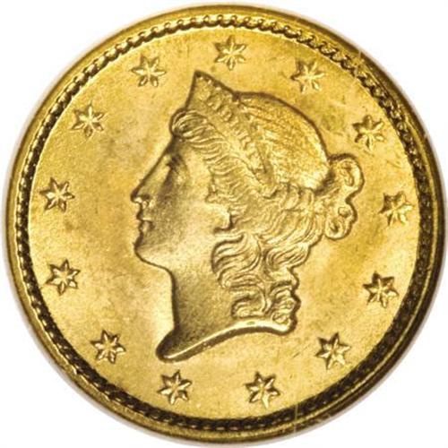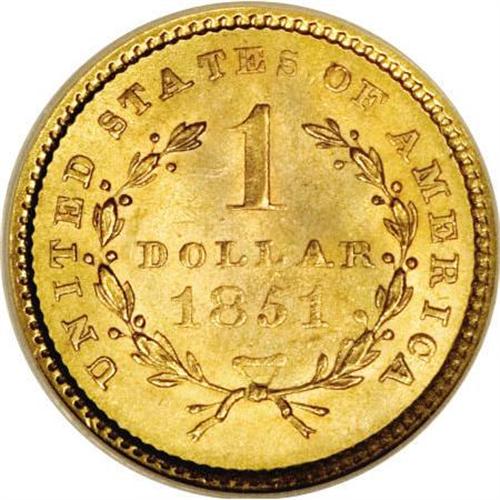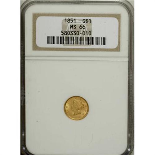 <B>1851 G$1 MS66 NGC.</B></I> This Premium Gem gold dollar is intensely lustrous and displays enticing peach-gold and lime coloration. Just a bit of central striking weakness is noted on each side. A faint die clash mark is observed on the upper reverse, but post-strike surface blemishes are virtually nonexistent. Census: 19 in 66, 8 finer (10/07). <I><BR>From The Nick-A-Jack Collection.</B></I><BR><BR><B>Coin Engraver:</B> James B. Longacre<BR><BR><b>Shipping:</b> Coins & Currency (<a target="_blank" href="http://www.heritageauctions.com/common/shipping.php">view shipping information</a>)