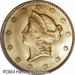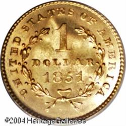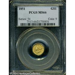 1851 G$1 MS66 PCGS. The 1851 is a common date in t <B>1851 G$1 MS66 PCGS.</B></I> The 1851 is a common date in the Type One series, as one might infer from the mintage of 3.3 million pieces. Nevertheless, it is infrequently encountered in MS66 condition. Only 19 other coins have been so graded by PCGS with seven finer (11/04). Rich reddish-golden color covers each side of this lustrous Premium Gem. Only the hair of Liberty is slightly soft, while all the other design elements are sharply detailed. <BR><BR><B>Important notice:</B> Heritage usually auctions material at the rate of 200-250 lots per hour. On some occasions eBay Live bid software or the Internet may not be able to keep up with the pace of the auction. We recommend placing a realistic absentee bid now as insurance to avoid disappointment. Occasionally the auctioneer may eliminate or reject an eBay Live bid, and the auctioneer may also reopen a lot after the close of the eBay live bidding (usually because we missed an audience bid), and may reject your bid even if it shows you as the winning bidder. By bidding via eBay Live, you agree that Heritage may award the lot to another bidder at its sole discretion under the circumstances described above or any other reasonable circumstances. Since eBay bids are not shown to us until we open the lot on the floor, we treat those bids just like floor bids. In most cases the floor responds before the eBay bid is presented to us, due to Internet lag time, so for consistency we have made it a policy that floor bids are always considered first over tie eBay live bids. Also please note that all Heritage lots purchased through eBay Live carry a 20% Buyer's Premium. Please make sure you read the Terms and Conditions before you bid. This lot is being auctioned in conjunction with a live floor auction by Heritage Galleries & Auctioneers. All final auction and invoice information will be supplied by Heritage Galleries & Auctioneers, and all other information should be considered preliminary. Lot:6428