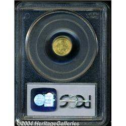 <B>1851<G$1> MS66 PCGS.</B></I> For the first time since the inception of the denomination in 1849, Gold Dollar production at the Philadelphia Mint topped 1 million coins in 1851. A staggering total of 3.3 millions coins were produced, and, as one might surmise from this mintage figure, the 1851-P is a popular and readily obtainable coin for type purposes. Of course, at the MS66 level, this issue is a significant condition rarity. A simply breathtaking pristine Gem, the surfaces are overlaid in coruscating mint frost that exhibits a subtle green-gold color. We have no doubt about this coin's originality, and the razor sharp striking definition enhances the already memorable eye appeal. A tiny toning spot at the base of the first 1 of the date may be useful for future pedigree purposes. <BR><BR><B>Important notice:</B> Heritage usually auctions material at the rate of 200-250 lots per hour. On some occasions eBay Live bid software or the Internet may not be able to keep up with the pace of the auction. We recommend placing a realistic absentee bid now as insurance to avoid disappointment. Occasionally the auctioneer may eliminate or reject an eBay Live bid, and the auctioneer may also reopen a lot after the close of the eBay live bidding (usually because we missed an audience bid), and may reject your bid even if it shows you as the winning bidder. By bidding via eBay Live, you agree that Heritage may award the lot to another bidder at its sole discretion under the circumstances described above or any other reasonable circumstances. Since eBay bids are not shown to us until we open the lot on the floor, we treat those bids just like floor bids. In most cases the floor responds before the eBay bid is presented to us, due to Internet lag time, so for consistency we have made it a policy that floor bids are always considered first over tie eBay live bids. Also please note that all Heritage lots purchased through eBay Live carry a 20% Buyer's Premium. Please make sure you read the Terms and Conditions before you bid.