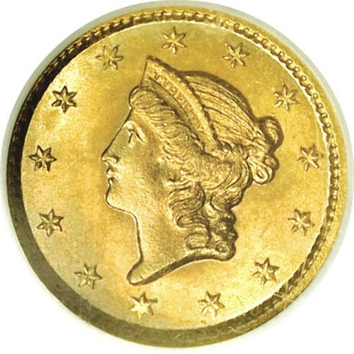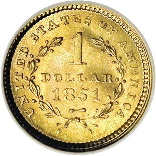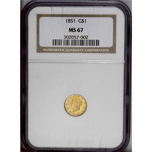 <B>1851<G$1> MS67 NGC.</B></I> For the first time since the inception of the denomination in 1849, gold dollar production at the Philadelphia Mint topped 1 million coins in 1851. A staggering total of 3.3 millions coins were produced, and, as one might surmise from this mintage figure, the 1851-P is a popular and readily obtainable coin for type purposes. Of course, at the MS67 level, this issue is a significant condition rarity. A simply breathtaking Superb Gem, the surfaces are overlaid in coruscating mint frost that exhibits a subtle steel-gray and orange-gold color. We have no doubt about this coin's originality, and the razor sharp striking definition enhances the already memorable eye appeal. Census: 4 in 67, 4 finer (8/06).