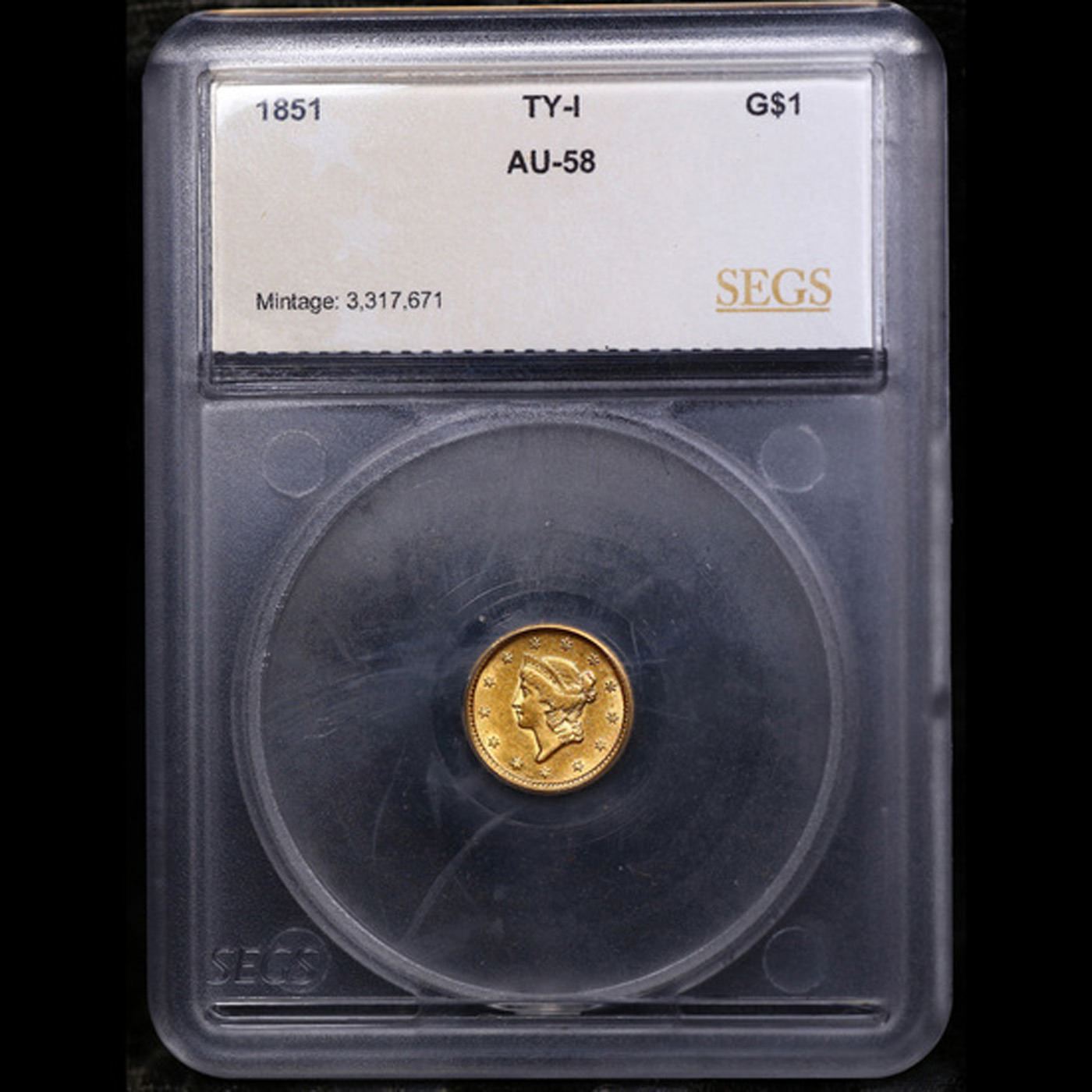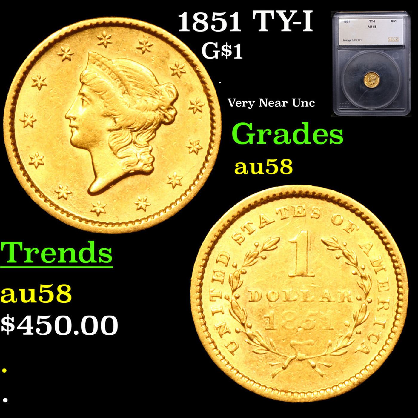 1851 TY-I Gold Dollar $1 Graded au58 BY SEGS.