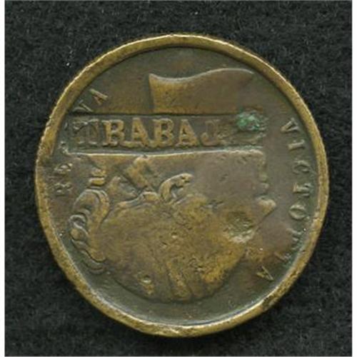 <B>1851 Great Britain Crystal Palace Token Counterstamped.</B></I> Bronze. British commemorative medal issued for the Crystal Palace, dated 1851, counterstamped twice, once on each side, with <B>TRABAJO</B></I> ("I work" in Spanish). This interesting item may have been shipped to a foreign locale for use as a work token.<BR><BR><b>Shipping:</b> Coins & Currency (<a target="_blank" href="http://www.heritageauctions.com/common/shipping.php">view shipping information</a>)
