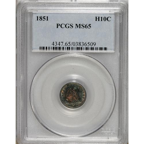 <B>1851 H10C MS65 PCGS.</B></I> Golden-brown and aquamarine endow this lustrous, attentively struck, and unabraded Gem. Scarcer than its mintage suggests, since its bullion value exceeded face and many were melted by speculators. Population: 11 in 65, 17 finer (3/07).<BR><BR><b>Shipping:</b> Coins & Currency (<a target="_blank" href="http://www.heritageauctions.com/common/shipping.php">view shipping information</a>)