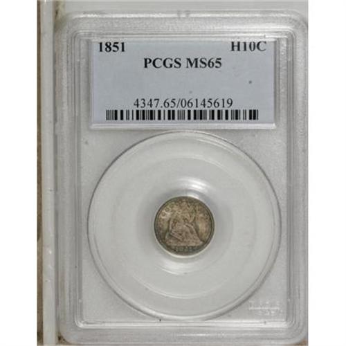<B>1851 H10C MS65 PCGS.</B></I> A medley of lavender, cobalt-blue, and olive-gray toning clings to highly lustrous surfaces, and a well directed strike brings out good detail on the design features. A couple of hair-thin marks are visible in the right obverse field.<BR><BR><B>Coin Engraver:</B> Christian Gobrecht<BR><BR><b>Shipping:</b> Coins & Currency (<a target="_blank" href="http://www.heritageauctions.com/common/shipping.php">view shipping information</a>)