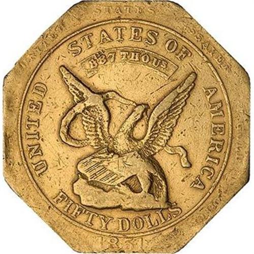 The popular (and extremely heavy, since it weighs two-and one half ounces) fifty dollar gold ingot struck by Augustus Humbert, United States Assayer. This generally choice specimen has most of but not all of the legend readable outside the central raised circle, with four date digits clearly seen. Parts of AUGUSTUS HUMBERT UNITED STATES ASSAYER OF GOLD SAN FRANCISCO are obliterated by wear or, in one spot, minor smoothing (above UNITED). The corners are decent and not smashed as on many. Normal circulation abrasions are accounted for in the grade. The fineness of these varied, but the mint settled on 887 THOUS for those struck from "native" alloys, and this is the type most often seen. On the back of the ingot or "slug" as collectors call these, is a design made by machinery. This engine-turned relief was the handiwork of the aforementioned Augustus Humbert himself, according to the records! The eagle with shield was designed and engraved by Curtis Wright who had the right stuff to create a lasting, timeless design to fascinate generations of coin collectors!