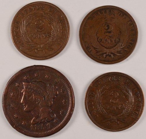 1851 LARGE CENT, VF, 1865? 2 CENT AG, 1865 2 CENT, XF+ 1864 2 CENT, XF+