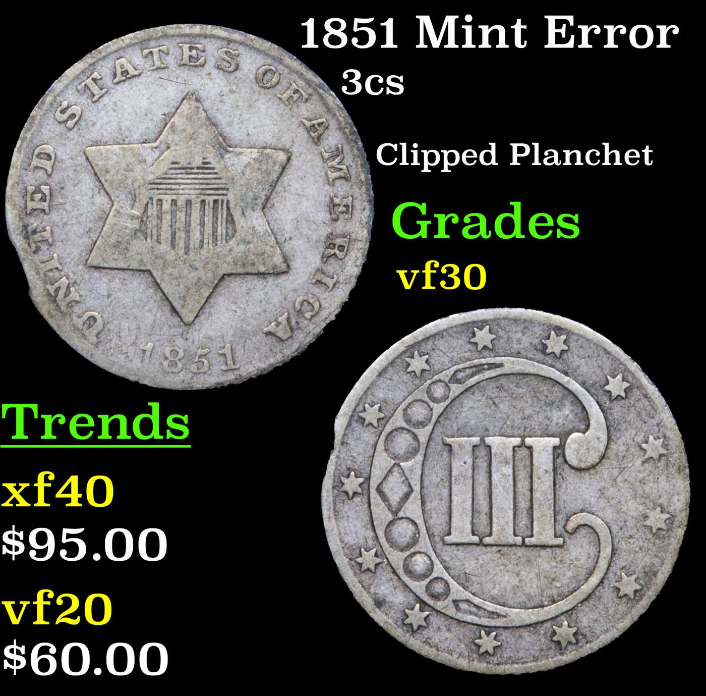 1851 Mint Error Three Cent Silver 3cs Grades vf++.