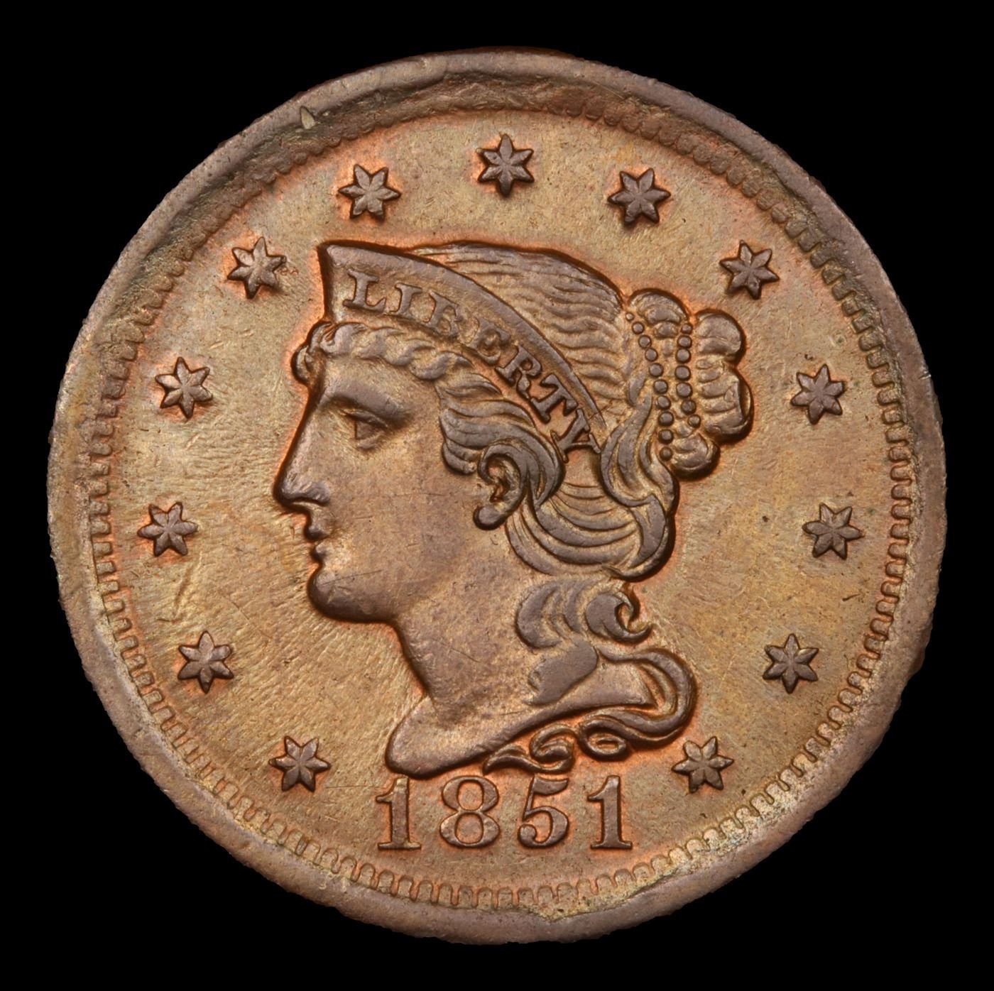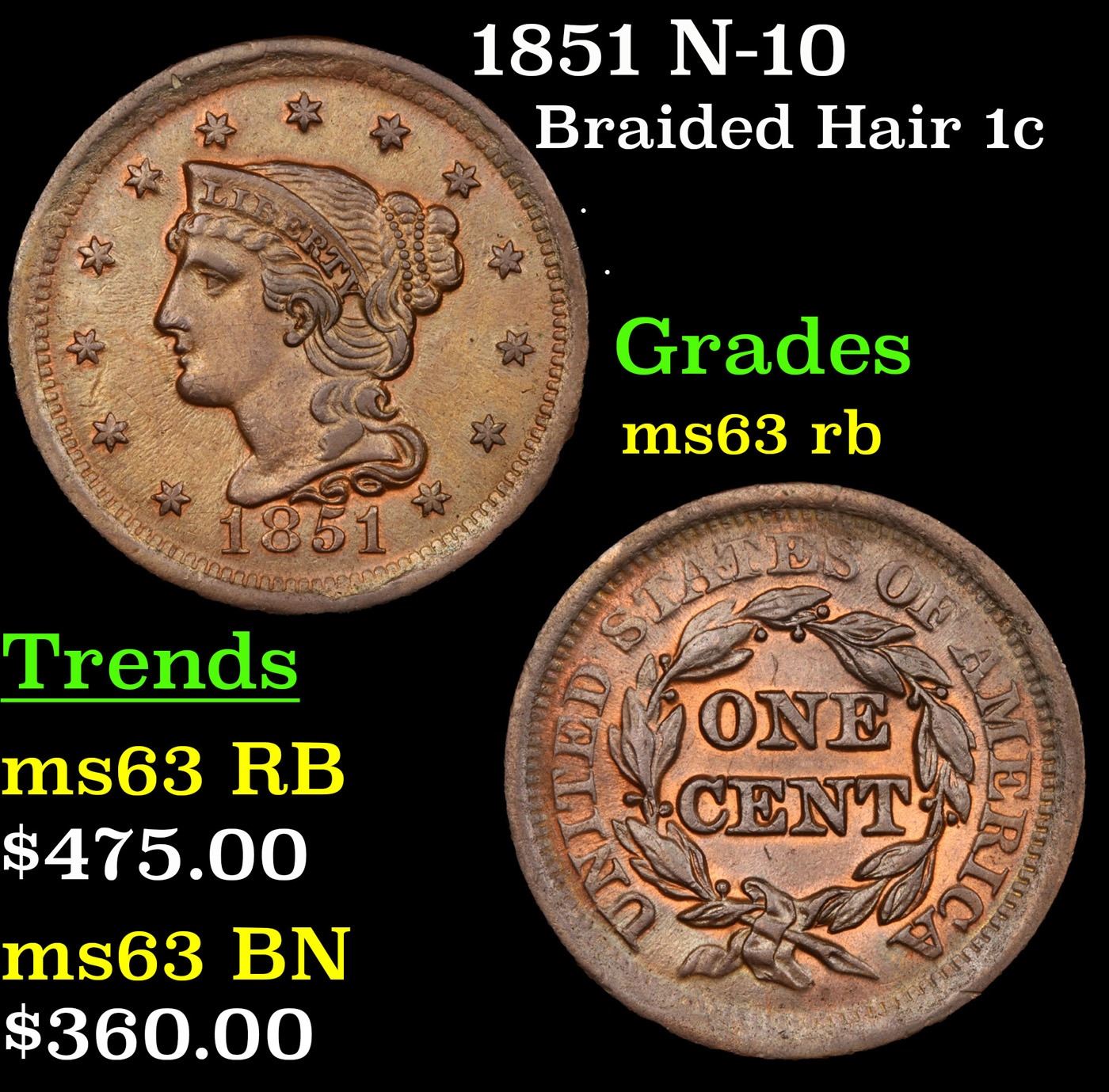 1851 N-10 Braided Hair Large Cent 1c Grades Select Unc RB. Ample rose-red color remains, both sides also lightly toned in iridescent gray-brown. Noyes Die State C/C