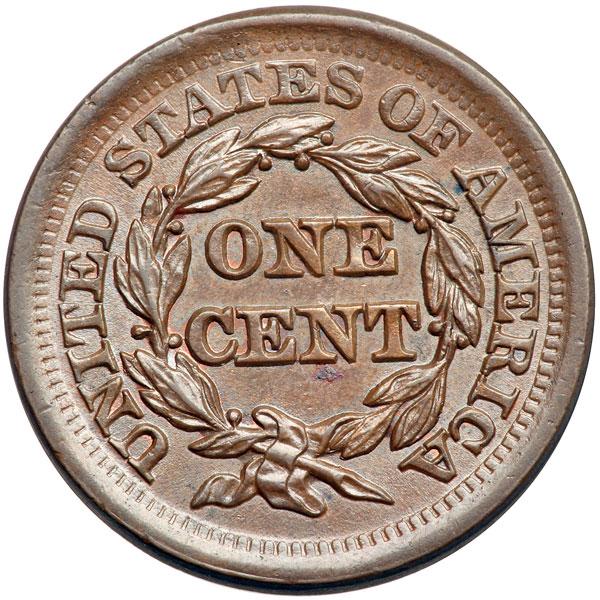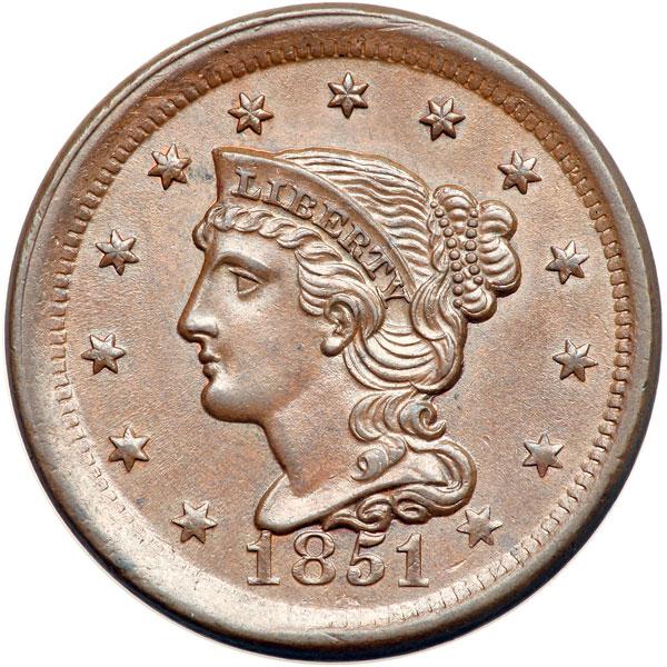 1851 N-10 R1 MS60. Frosty medium brown with lighter steel brown toning in protected areas and a couple small peeps of mint red on both sides. There is a speck of carbon right of star 5, another under the N in CENT, and a couple tiny rim ticks at STA. MDS, die state a late. The die lines from the dentils at stars 1-2 are weak but remain visible. DWH #2156.