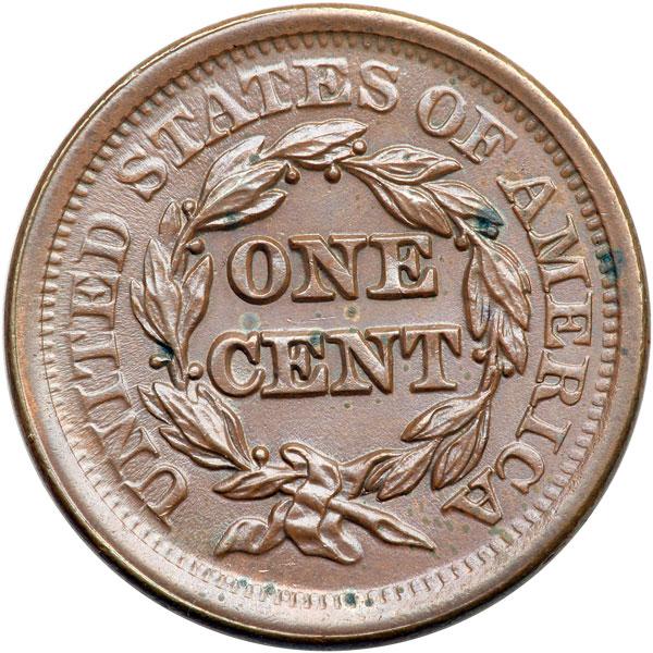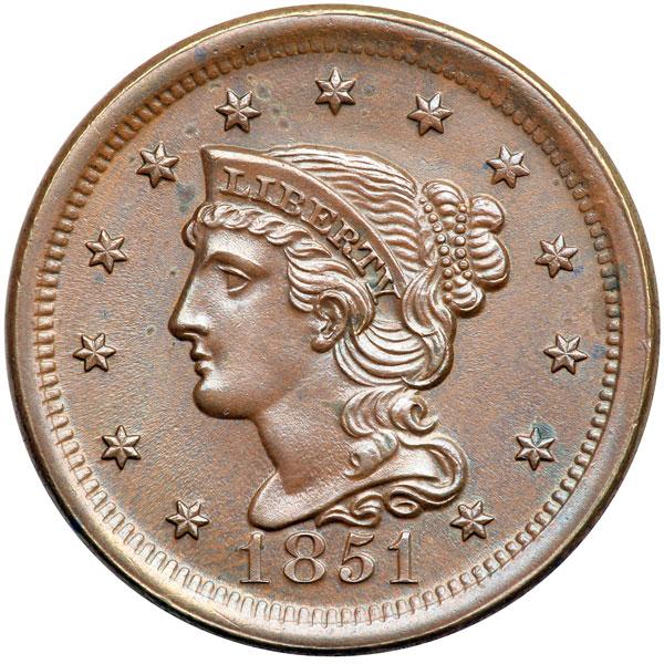 1851 N-12 R1 AU55. Very close to mint state but there are a half dozen small spots of carbon, the strongest one on the leaf under the first A in AMERICA. Very lightly cleaned, now retoned glossy light steel brown. LDS, die state d. The lines and points at the main and inner curls are gone (Newcomb's old #11). DWH #1145.